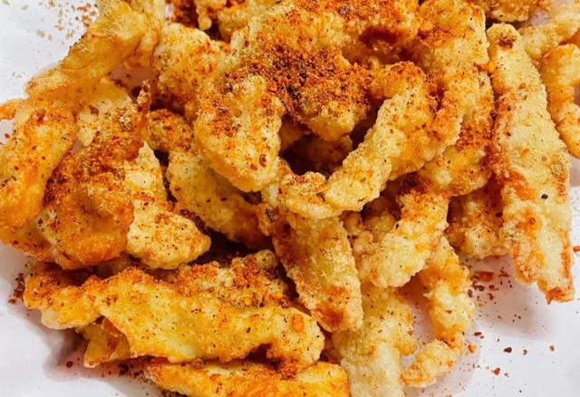 炸好的鸡柳,放上辣椒面拌一拌,就可以开吃了。